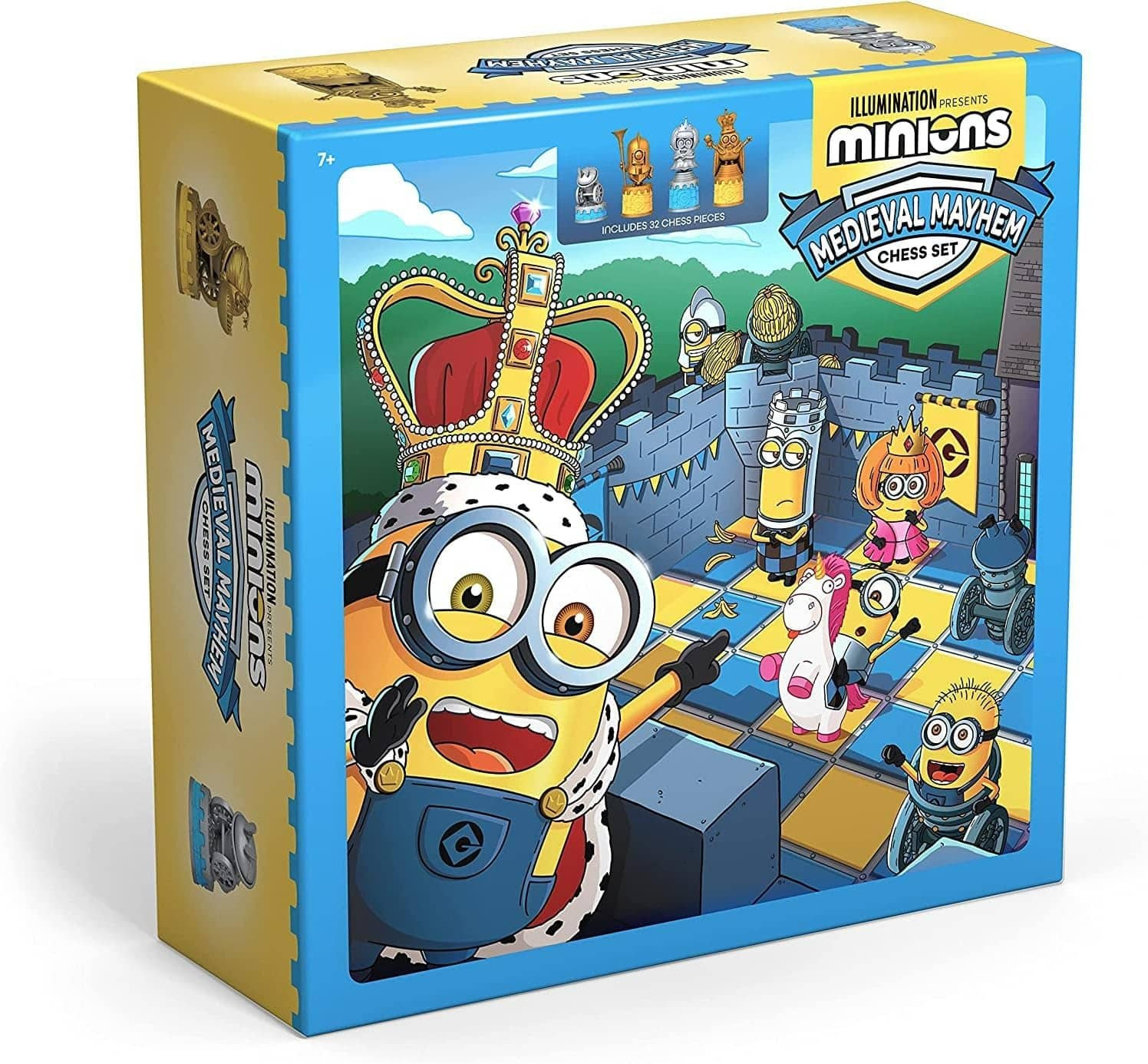 Minions Medieval Mayhem Chess Set Despicable Me game board featuring King Bob design with blue and yellow squares.