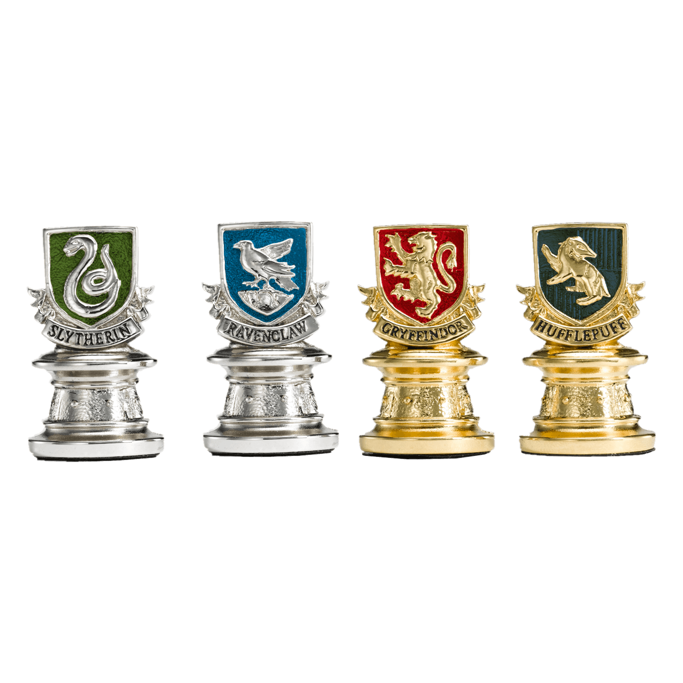 Quidditch Chess Set pieces representing Slytherin, Ravenclaw, Gryffindor, and Hufflepuff houses.