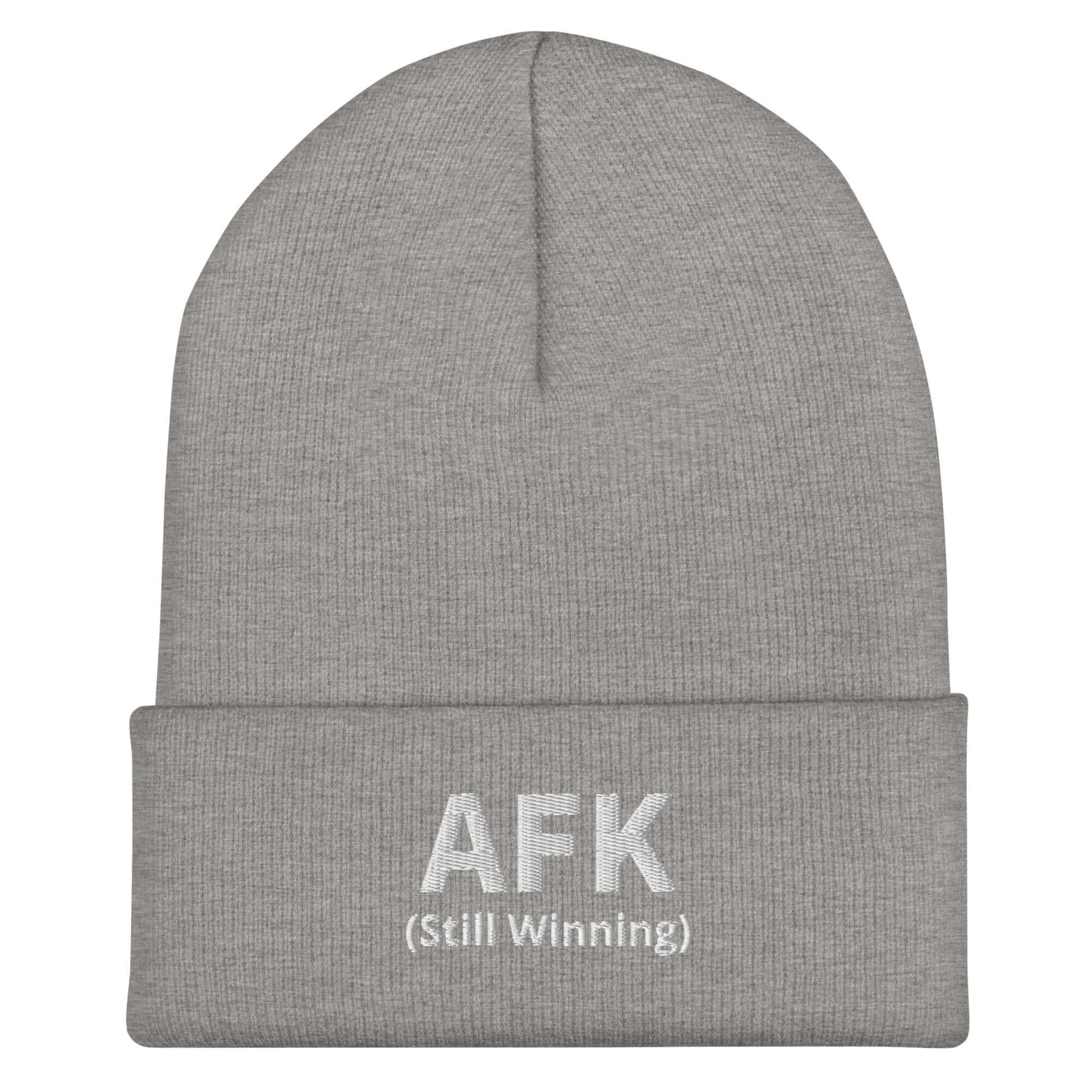 AFK cuffed beanie in navy color featuring "AFK (Still Winning)" embroidered on the front.
