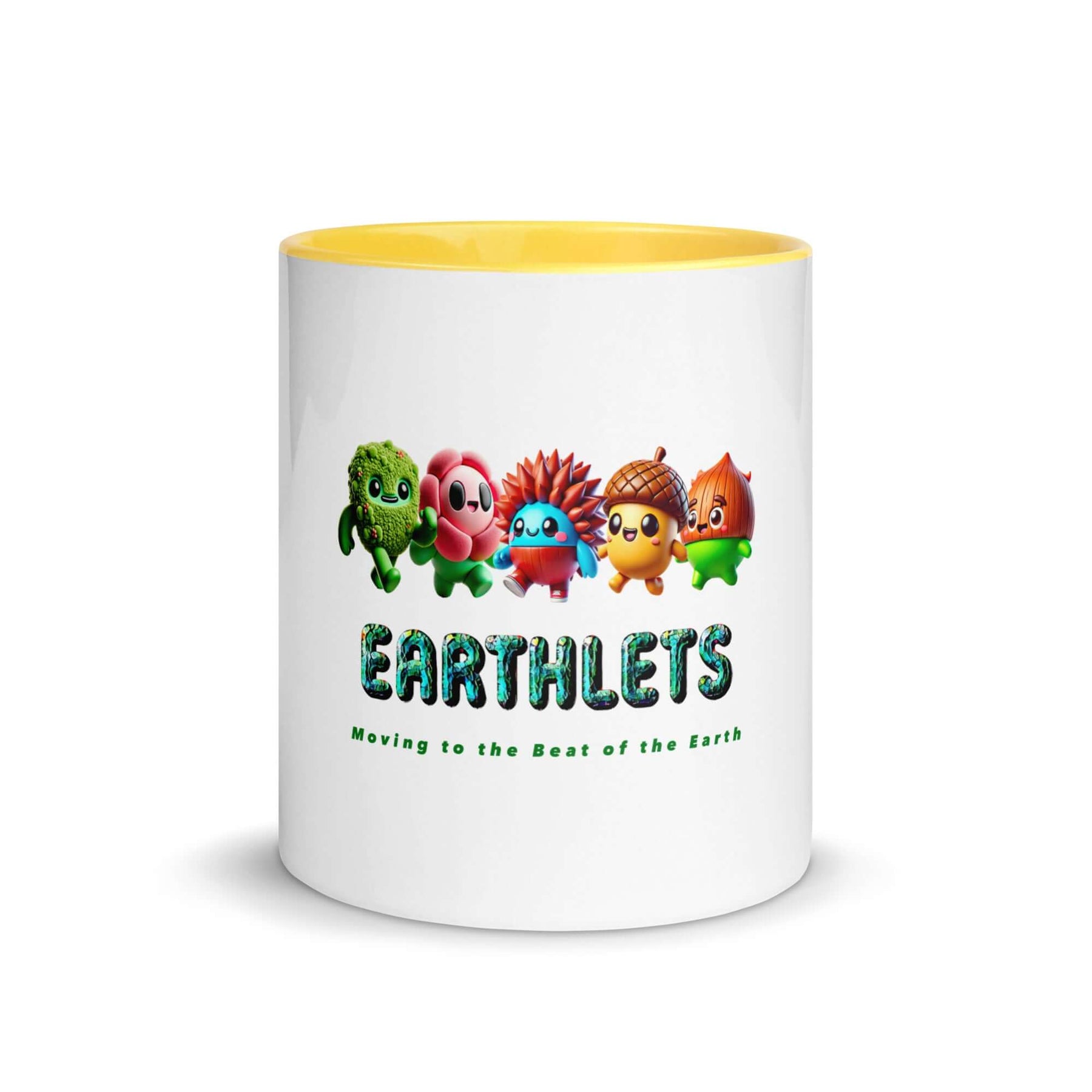 Earthlets mug featuring colorful cartoon characters and logo on a bright yellow background.