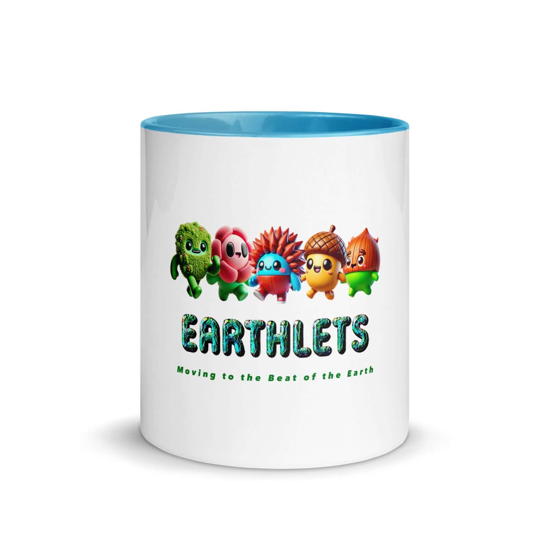 Earthlets mug featuring colorful characters and blue interior, with text 'Moving to the Beat of the Earth' on a white ceramic background.
