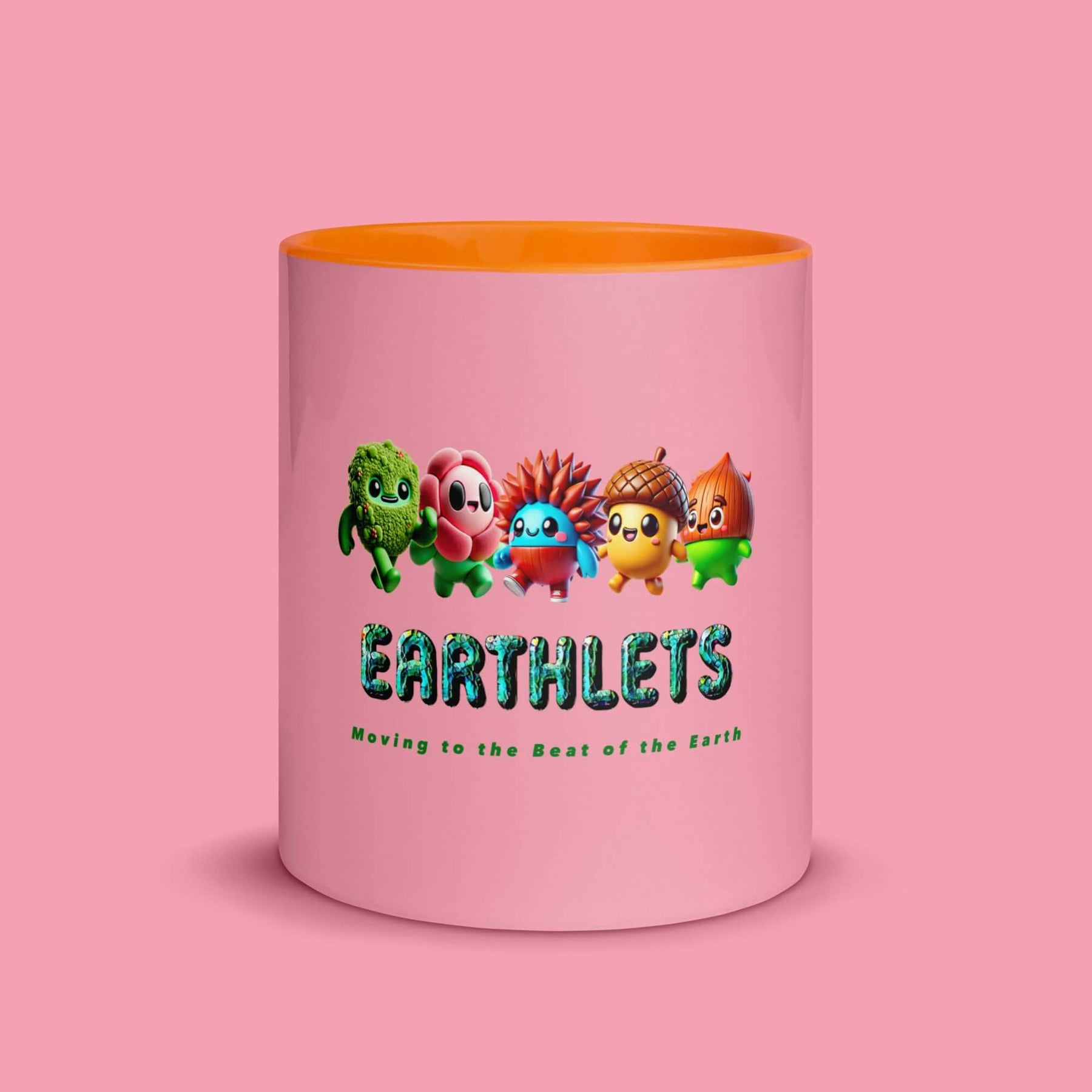 Colorful Earthlets mug with vibrant orange interior and cartoon characters design, showcasing unique branding.